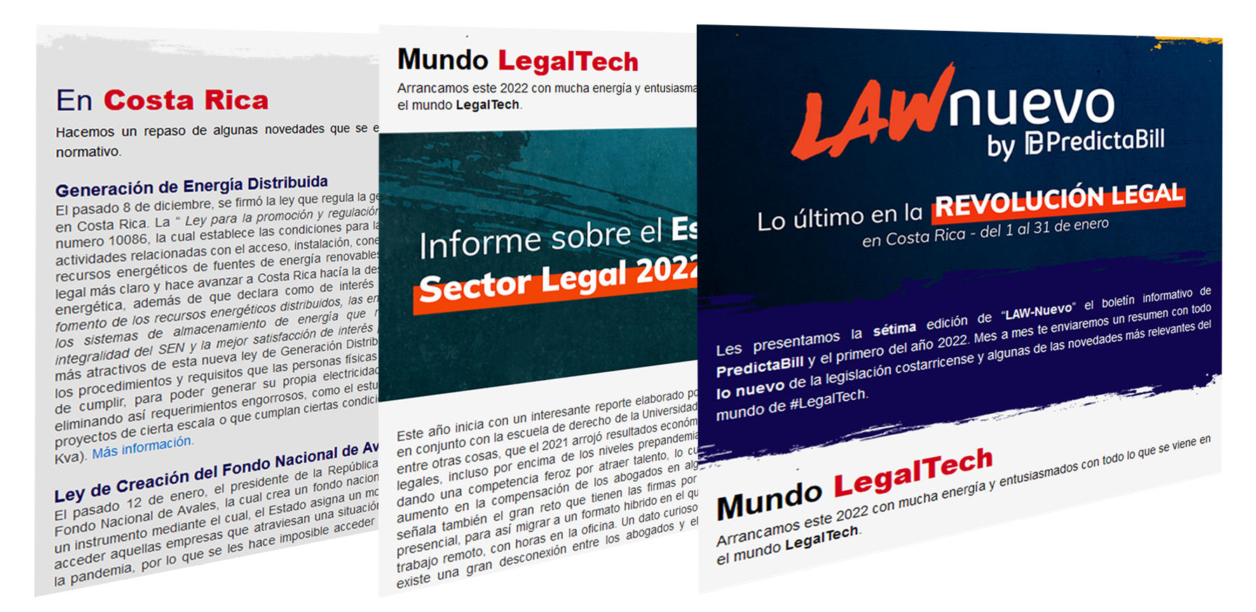Boletín mensual gratuito cuyo propósito es informar acerca de todo “lo nuevo” en cuanto a legislación Costarricense y las ultimas tendencias en el mundo del legaltech. El tener un equipo diverso con programadores nos permite monitorear y tener un mejor entendimiento de las últimas tecnologías que impactan el mercado legal.